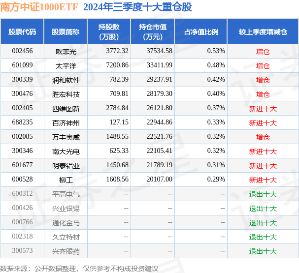 南方中证1000ETF的前十大重仓股如下: