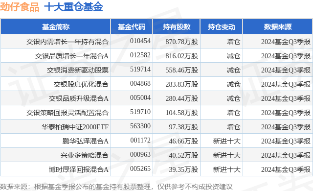 重仓劲仔食品的前十大公募基金请见下表: