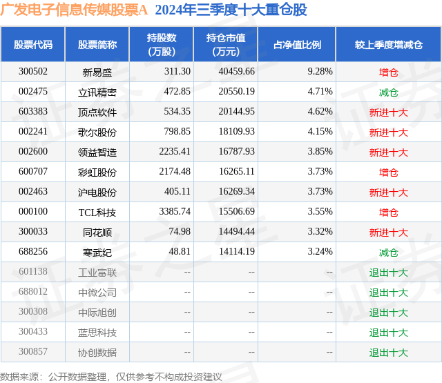 根据2024基金Q3季报公募基金重仓股数据,重仓该股的公募基金共50家,其中持有数量最多的公募基金为广发电子信息传媒股票A。广发电子信息传媒股票A目前规模为19.82亿元,最新净值2.2543(12月10日),较上一交易日上涨1.82%,近一年上涨2.37%。该公募基金现任基金经理为冯骋。