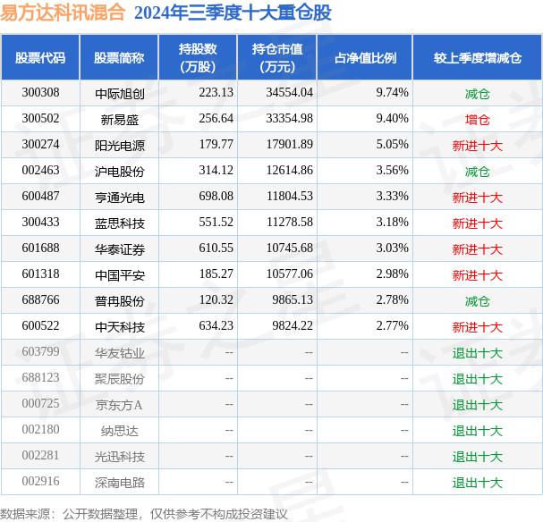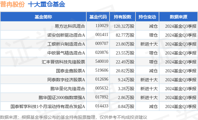 根据2024基金Q3季报公募基金重仓股数据,重仓该股的公募基金共12家,其中持有数量最多的公募基金为易方达科讯混合。易方达科讯混合目前规模为35.47亿元,最新净值1.5851(12月10日),较上一交易日上涨0.06%,近一年上涨19.32%。该公募基金现任基金经理为刘健维。刘健维在任的基金产品包括:易方达科融混合,管理时间为2020年6月6日至今,期间收益率为86.6%;易方达成长动力混合A,管理时间为2022年2月8日至今,期间收益率为9.7%。