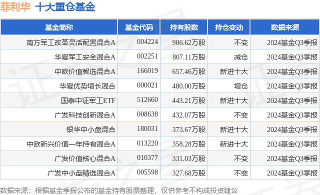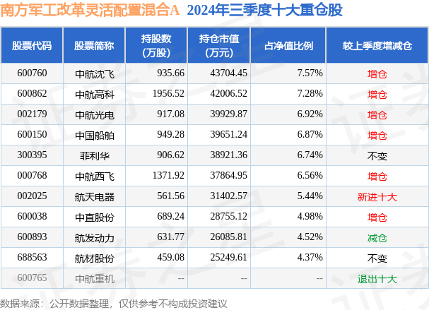 根据2024基金Q3季报公募基金重仓股数据,重仓该股的公募基金共89家,其中持有数量最多的公募基金为南方军工改革灵活配置混合A。南方军工改革灵活配置混合A目前规模为33.61亿元,最新净值1.1875(12月11日),较上一交易日下跌0.27%,近一年下跌0.27%。该公募基金现任基金经理为邹承原。邹承原在任的基金产品包括:南方领航优选混合A,管理时间为2022年11月18日至今,期间收益率为-16.37%。