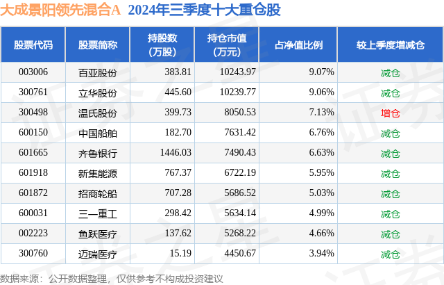 根据2024基金Q3季报公募基金重仓股数据,重仓该股的公募基金共43家,其中持有数量最多的公募基金为大成景阳领先混合A。大成景阳领先混合A目前规模为10.59亿元,最新净值0.7156(12月11日),较上一交易日上涨1.56%,近一年上涨4.16%。该公募基金现任基金经理为齐炜中。齐炜中在任的基金产品包括:大成消费主题混合A,管理时间为2020年2月3日至今,期间收益率为86.84%;大成一带一路灵活配置混合A,管理时间为2021年3月17日至今,期间收益率为8.88%;大成蓝筹稳健混合A,管理时间为2021年6月21日至今,期间收益率为-17.56%。