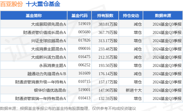 重仓百亚股份的前十大公募基金请见下表: