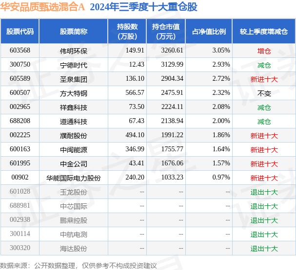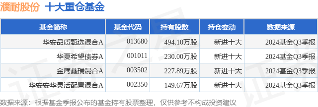 根据2024基金Q3季报公募基金重仓股数据,重仓该股的公募基金共4家,其中持有数量最多的公募基金为华安品质甄选混合A。华安品质甄选混合A目前规模为8.32亿元,最新净值0.9109(12月11日),较上一交易日上涨0.37%,近一年上涨5.49%。该公募基金现任基金经理为刘畅畅。刘畅畅在任的基金产品包括:华安文体健康混合A,管理时间为2020年1月8日至今,期间收益率为133.26%;华安安华灵活配置混合A,管理时间为2021年8月10日至今,期间收益率为-0.24%;华安产业精选混合A,管理时间为2021年12月29日至今,期间收益率为-11.0%;