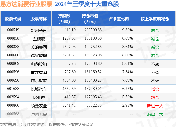 根据2024基金Q3季报公募基金重仓股数据,重仓该股的公募基金共6家,其中持有数量最多的公募基金为易方达消费行业股票。易方达消费行业股票目前规模为220.67亿元,最新净值3.665(12月11日),较上一交易日上涨0.85%,近一年上涨6.54%。该公募基金现任基金经理为萧楠 王元春。萧楠在任的基金产品包括:易方达瑞恒灵活配置混合,管理时间为2018年1月10日至今,期间收益率为136.11%;易方达消费精选股票,管理时间为2020年4月13日至今,期间收益率为-15.71%;易方达高质量严选三年持有,管理时间为2020年11月12日至今,期间收益率为-25.14%。王元春在任的基金产品包括:易方达瑞恒灵活配置混合,管理时间为2018年12月8日至今,期间收益率为205.45%;易方达现代服务业混合,管理时间为2018年12月8日至今,期间收益率为129.8%;易方达标普消费品指数A,管理时间为2021年5月29日至今,期间收益率为5.86%。