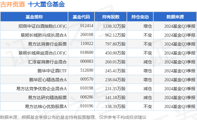 根据2024基金Q3季报公募基金重仓股数据,重仓该股的公募基金共107家,其中持有数量最多的公募基金为招商中证白酒指数(LOF)C。招商中证白酒指数(LOF)C目前规模为119.71亿元,最新净值0.8702(12月11日),较上一交易日上涨0.44%,近一年下跌8.0%。该公募基金现任基金经理为侯昊。侯昊在任的基金产品包括:招商大宗商品(LOF),管理时间为2017年9月5日至今,期间收益率为24.56%;招商中证银行指数A,管理时间为2017年9月5日至今,期间收益率为56.97%;招商深证100指数A,管理时间为2017年9月5日至今,期间收益率为38.05%;招商央视财经50指数A,管理时间为2017年9月5日至今,期间收益率为60.99%。