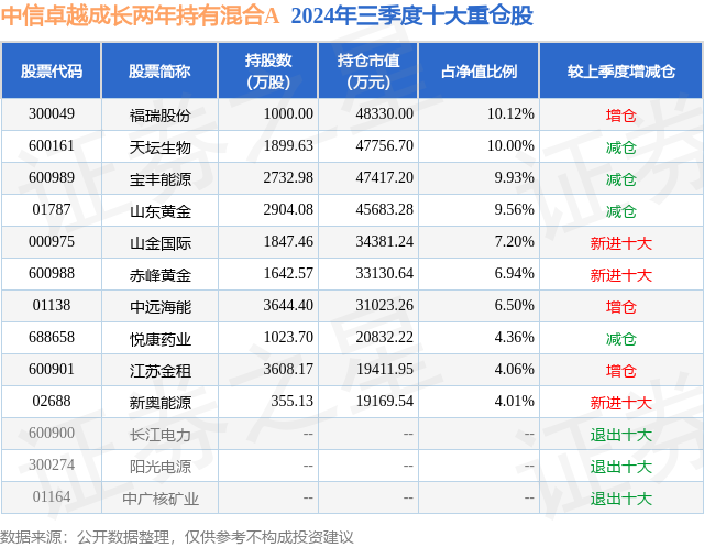 中信卓越成长两年持有混合A的前十大重仓股如下: