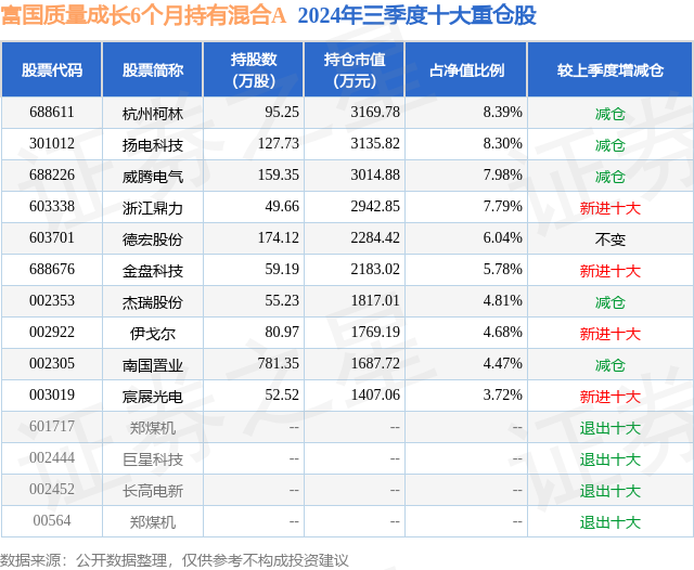 富国质量成长6个月持有混合A的前十大重仓股如下: