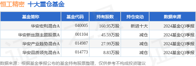根据2024基金Q3季报公募基金重仓股数据,重仓该股的公募基金共4家,其中持有数量最多的公募基金为华安宏利混合A。华安宏利混合A目前规模为18.26亿元,最新净值5.2446(12月13日),较上一交易日下跌1.46%,近一年下跌14.96%。该公募基金现任基金经理为王春。王春在任的基金产品包括:华安新丝路主题股票A,管理时间为2022年3月28日至今,期间收益率为-34.86%;华安产业趋势混合A,管理时间为2022年8月3日至今,期间收益率为-30.84%;华安品质领先混合A,管理时间为2022年8月5日至今,期间收益率为-39.15%。