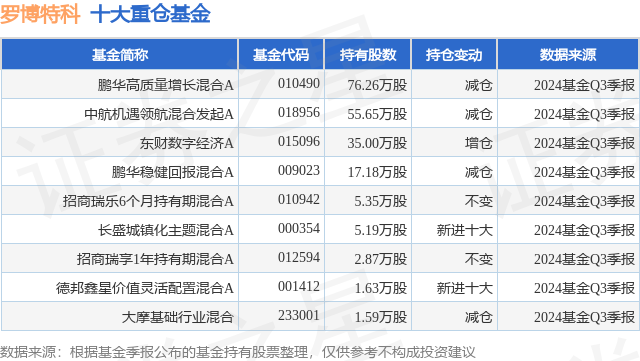 根据2024基金Q3季报公募基金重仓股数据,重仓该股的公募基金共9家,其中持有数量最多的公募基金为鹏华高质量增长混合A。鹏华高质量增长混合A目前规模为8.71亿元,最新净值0.7769(12月13日),较上一交易日下跌2.72%,近一年上涨6.66%。该公募基金现任基金经理为胡颖。胡颖在任的基金产品包括:鹏华稳健回报混合A,管理时间为2021年11月16日至今,期间收益率为-6.83%;