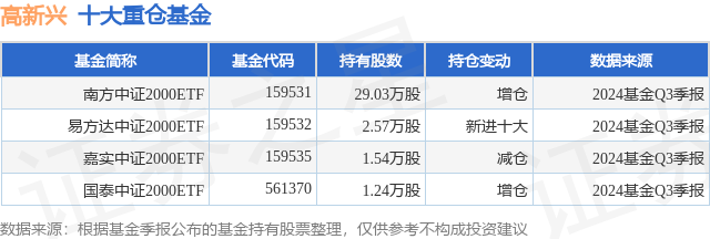 根据2024基金Q3季报公募基金重仓股数据,重仓该股的公募基金共4家,其中持有数量最多的公募基金为南方中证2000ETF。南方中证2000ETF目前规模为7.85亿元,最新净值1.1229(12月13日),较上一交易日下跌1.6%,近一年上涨8.5%。该公募基金现任基金经理为李佳亮。李佳亮在任的基金产品包括:南方MSCI中国A50互联互通ETF,管理时间为2021年10月29日至今,期间收益率为-17.91%;南方MSCI中国A50互联互通ETF联接A,管理时间为2022年1月10日至今,期间收益率为-8.82%;南方基金南方东英富时亚太低碳精选ETF(QDII),管理时间为2022年12月16日至今,期间收益率为28.7%;南方北证50成份指数发起A,管理时间为2022年12月23日至今,期间收益率为16.6%。