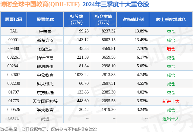 博时全球中国教育(QDII-ETF)的前十大重仓股如下: