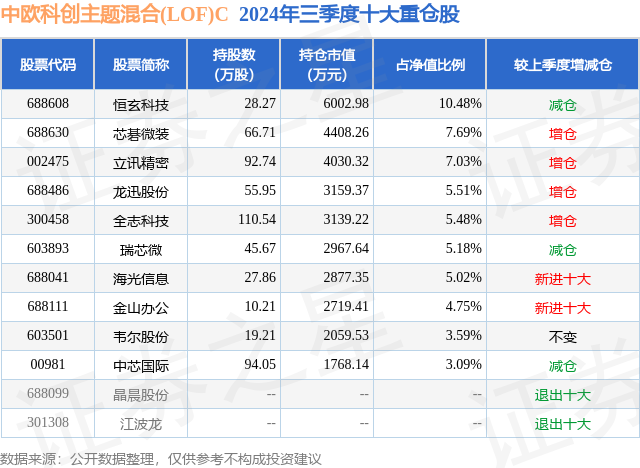 中欧科创主题混合(LOF)C的前十大重仓股如下: