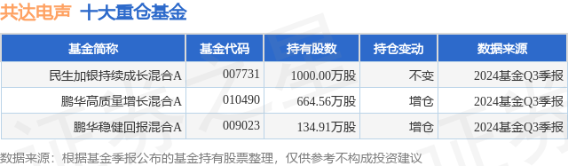 根据2024基金Q3季报公募基金重仓股数据,重仓该股的公募基金共3家,其中持有数量最多的公募基金为民生加银持续成长混合A。民生加银持续成长混合A目前规模为5.46亿元,最新净值1.4348(12月17日),较上一交易日下跌0.49%,近一年上涨1.43%。该公募基金现任基金经理为朱辰喆。朱辰喆在任的基金产品包括:民生加银聚优精选混合,管理时间为2022年12月28日至今,期间收益率为-0.34%。