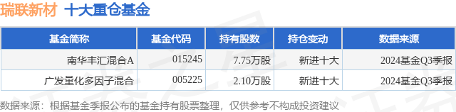 根据2024基金Q3季报公募基金重仓股数据,重仓该股的公募基金共2家,其中持有数量最多的公募基金为南华丰汇混合A。南华丰汇混合A目前规模为1.26亿元,最新净值1.3032(12月17日),较上一交易日下跌2.08%,近一年上涨4.5%。该公募基金现任基金经理为黄志钢。黄志钢在任的基金产品包括:南华瑞泽债券A,管理时间为2023年11月18日至今,期间收益率为5.49%;南华丰元量化选股混合A,管理时间为2024年1月23日至今,期间收益率为20.36%;南华丰睿量化选股混合A,管理时间为2024年11月5日至今,期间收益率为0.37%。