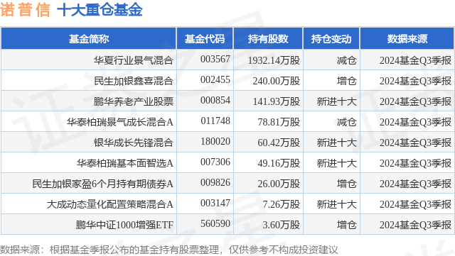 根据2024基金Q3季报公募基金重仓股数据,重仓该股的公募基金共9家,其中持有数量最多的公募基金为华夏行业景气混合。华夏行业景气混合目前规模为79.51亿元,最新净值3.1471(12月18日),较上一交易日上涨0.23%,近一年上涨18.77%。该公募基金现任基金经理为钟帅。钟帅在任的基金产品包括:华夏远见成长一年持有混合A,管理时间为2022年9月20日至今,期间收益率为-7.17%;华夏招鑫鸿瑞混合A,管理时间为2024年1月16日至今,期间收益率为33.96%。