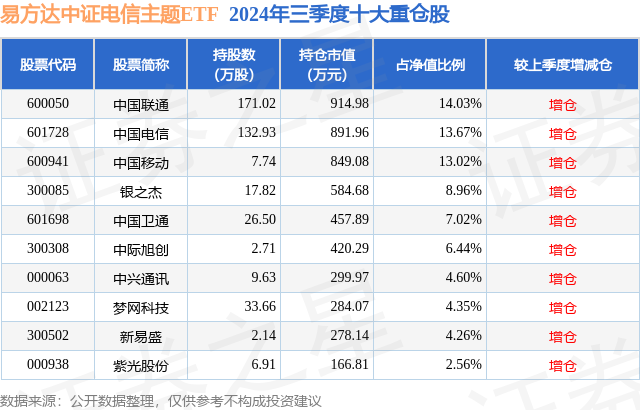 根据2024基金Q3季报公募基金重仓股数据,重仓该股的公募基金共2家,其中持有数量最多的公募基金为易方达中证电信主题ETF。易方达中证电信主题ETF目前规模为0.65亿元,最新净值1.3003(12月18日),较上一交易日上涨1.0%。该公募基金现任基金经理为鲍杰。鲍杰在任的基金产品包括:易方达中证全指证券公司ETF,管理时间为2022年12月7日至今,期间收益率为30.83%;易方达中证沪港深300ETF,管理时间为2022年12月10日至今,期间收益率为5.48%;易方达黄金ETF联接A,管理时间为2023年8月19日至今,期间收益率为32.99%。