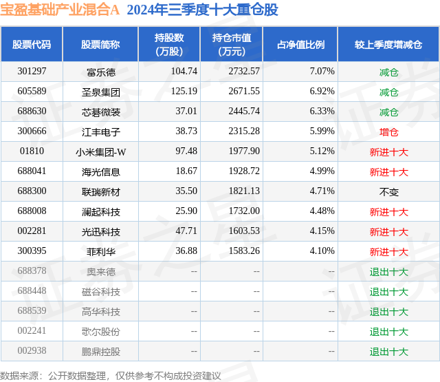 根据2024基金Q3季报公募基金重仓股数据,重仓该股的公募基金共3家,其中持有数量最多的公募基金为宝盈基础产业混合A。宝盈基础产业混合A目前规模为3.3亿元,最新净值1.0243(12月19日),较上一交易日上涨2.05%,近一年上涨9.84%。该公募基金现任基金经理为张天闻。张天闻在任的基金产品包括:宝盈半导体产业混合发起式A,管理时间为2022年12月5日至今,期间收益率为31.72%;宝盈人工智能股票A,管理时间为2023年4月15日至今,期间收益率为6.22%;宝盈智慧生活混合A,管理时间为2023年4月15日至今,期间收益率为7.92%。