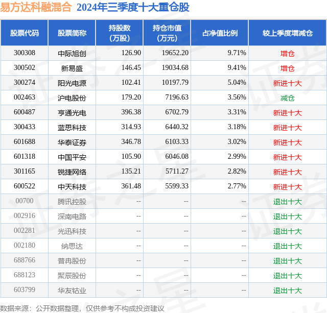 根据2024基金Q3季报公募基金重仓股数据,重仓该股的公募基金共3家,其中持有数量最多的公募基金为易方达科融混合。易方达科融混合目前规模为20.23亿元,最新净值2.9369(12月19日),较上一交易日上涨1.63%,近一年上涨27.56%。该公募基金现任基金经理为刘健维。刘健维在任的基金产品包括:易方达科讯混合,管理时间为2019年7月12日至今,期间收益率为92.28%;易方达成长动力混合A,管理时间为2022年2月8日至今,期间收益率为9.89%。