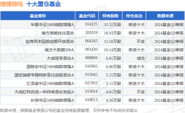 重仓捷捷微电的前十大公募基金请见下表: