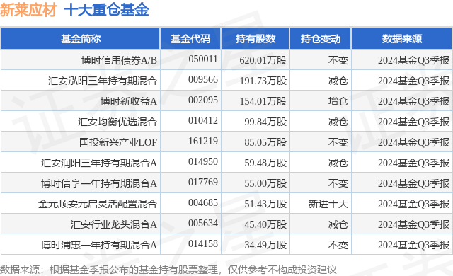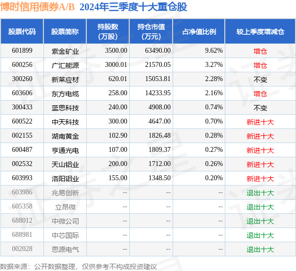根据2024基金Q3季报公募基金重仓股数据,重仓该股的公募基金共16家,其中持有数量最多的公募基金为博时信用债券A/B。博时信用债券A/B目前规模为59.23亿元,最新净值3.1269(12月19日),较上一交易日下跌0.31%,近一年上涨13.79%。该公募基金现任基金经理为过钧。过钧在任的基金产品包括:博时新收益A,管理时间为2016年2月29日至今,期间收益率为96.73%;博时双季鑫6个月持有混合A,管理时间为2021年1月20日至今,期间收益率为1.78%;博时浦惠一年持有期混合A,管理时间为2022年2月17日至今,期间收益率为-7.84%。