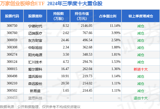 万家创业板综合ETF的前十大重仓股如下:
