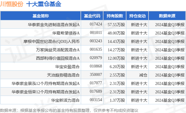 重仓川恒股份的前十大公募基金请见下表: