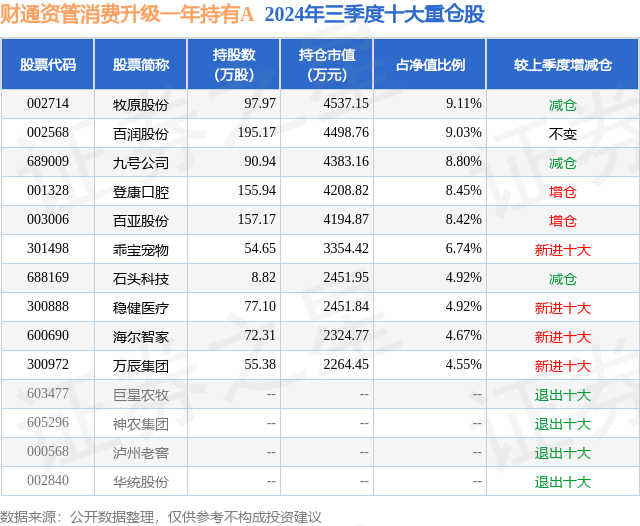 财通资管消费升级一年持有A的前十大重仓股如下: