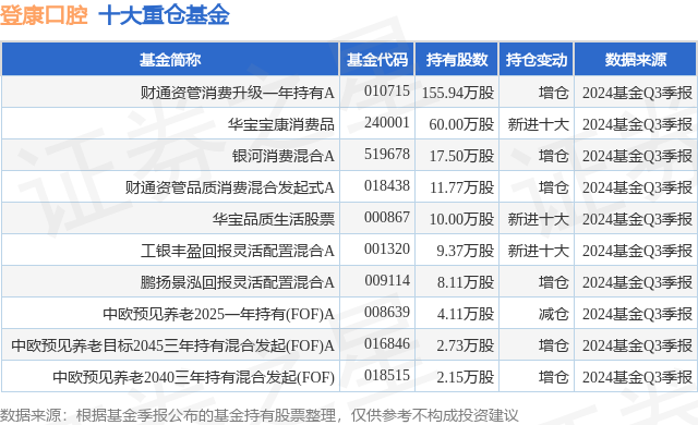 根据2024基金Q3季报公募基金重仓股数据,重仓该股的公募基金共14家,其中持有数量最多的公募基金为财通资管消费升级一年持有A。财通资管消费升级一年持有A目前规模为4.74亿元,最新净值0.725(12月19日),较上一交易日上涨0.49%,近一年上涨6.13%。该公募基金现任基金经理为于洋 林伟。于洋在任的基金产品包括:财通资管消费精选混合A,管理时间为2018年9月14日至今,期间收益率为57.32%;林伟在任的基金产品包括:财通资管品质消费混合发起式A,管理时间为2023年5月11日至今,期间收益率为14.65%;