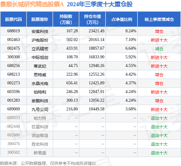根据2024基金Q3季报公募基金重仓股数据,重仓该股的公募基金共4家,其中持有数量最多的公募基金为景顺长城研究精选股票A。景顺长城研究精选股票A目前规模为11.24亿元,最新净值1.587(12月19日),较上一交易日上涨2.19%,近一年上涨30.62%。该公募基金现任基金经理为张雪薇。张雪薇在任的基金产品包括:景顺长城电子信息产业股票A,管理时间为2022年5月25日至今,期间收益率为18.9%;