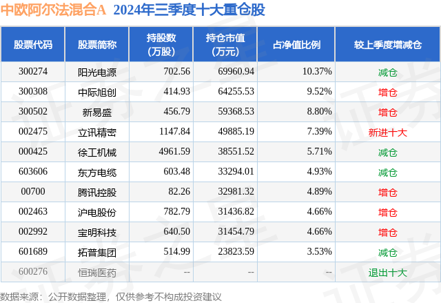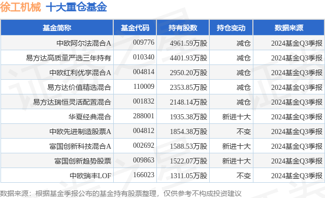 根据2024基金Q3季报公募基金重仓股数据,重仓该股的公募基金共152家,其中持有数量最多的公募基金为中欧阿尔法混合A。中欧阿尔法混合A目前规模为42.26亿元,最新净值0.6541(12月19日),较上一交易日上涨0.57%,近一年上涨3.24%。该公募基金现任基金经理为彭炜。彭炜在任的基金产品包括:中欧盛世成长混合(LOF)A,管理时间为2023年7月17日至今,期间收益率为-10.13%;中欧产业领航混合A,管理时间为2024年3月19日至今,期间收益率为11.73%。