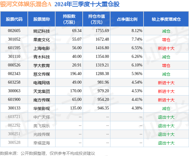银河文体娱乐混合A的前十大重仓股如下: