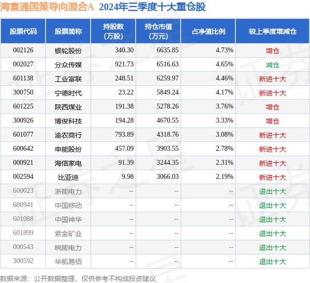 海富通国策导向混合A的前十大重仓股如下: