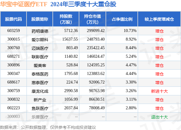根据2024基金Q3季报公募基金重仓股数据,重仓该股的公募基金共81家,其中持有数量最多的公募基金为华宝中证医疗ETF。华宝中证医疗ETF目前规模为278.81亿元,最新净值0.3344(12月23日),较上一交易日下跌1.09%,近一年下跌12.44%。该公募基金现任基金经理为胡洁。胡洁在任的基金产品包括:华宝中证银行ETF联接A,管理时间为2012年10月16日至今,期间收益率为145.37%;华宝医疗ETF联接A,管理时间为2015年5月21日至今,期间收益率为-62.47%;华宝中证军工ETF,管理时间为2016年8月5日至今,期间收益率为22.0%;华宝中证银行ETF,管理时间为2017年7月18日至今,期间收益率为42.12%。