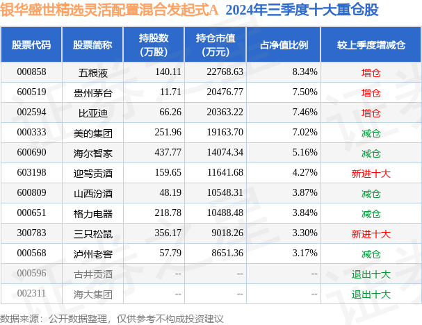 根据2024基金Q3季报公募基金重仓股数据,重仓该股的公募基金共24家,其中持有数量最多的公募基金为银华盛世精选灵活配置混合发起式A。银华盛世精选灵活配置混合发起式A目前规模为27.18亿元,最新净值1.5471(12月23日),较上一交易日下跌0.83%,近一年上涨1.42%。该公募基金现任基金经理为李晓星 张萍。李晓星在任的基金产品包括:银华中小盘混合,管理时间为2015年7月7日至今,期间收益率为122.76%;银华心诚灵活配置混合A,管理时间为2018年3月12日至今,期间收益率为43.06%;银华心怡灵活配置混合A,管理时间为2018年7月5日至今,期间收益率为159.63%。张萍在任的基金产品包括:银华中小盘混合,管理时间为2018年11月6日至今,期间收益率为88.27%;银华心诚灵活配置混合A,管理时间为2019年3月19日至今,期间收益率为51.3%;银华心怡灵活配置混合A,管理时间为2019年9月20日至今,期间收益率为76.62%。