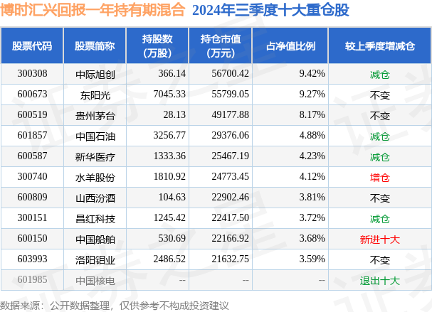 根据2024基金Q3季报公募基金重仓股数据,重仓该股的公募基金共4家,其中持有数量最多的公募基金为博时汇兴回报一年持有期混合。博时汇兴回报一年持有期混合目前规模为60.19亿元,最新净值0.7132(12月23日),较上一交易日下跌0.86%,近一年上涨9.5%。该公募基金现任基金经理为吴渭。吴渭在任的基金产品包括:博时汇智回报灵活配置混合,管理时间为2017年4月12日至今,期间收益率为117.5%;博时汇荣回报混合A,管理时间为2021年8月24日至今,期间收益率为-20.08%。
