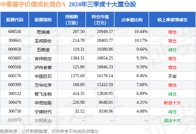 中泰星宇价值成长混合A的前十大重仓股如下: