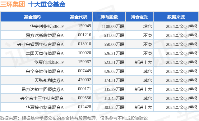 重仓三环集团的前十大公募基金请见下表: