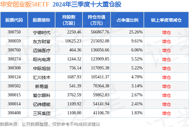 根据2024基金Q3季报公募基金重仓股数据,重仓该股的公募基金共180家,其中持有数量最多的公募基金为华安创业板50ETF。华安创业板50ETF目前规模为224.4亿元,最新净值0.9819(12月23日),较上一交易日下跌0.7%,近一年上涨29.33%。该公募基金现任基金经理为许之彦。许之彦在任的基金产品包括:华安上证180ETF,管理时间为2009年9月5日至今,期间收益率为66.23%;华安上证180ETF联接A,管理时间为2009年9月29日至今,期间收益率为62.83%;华安黄金易ETF,管理时间为2013年7月18日至今,期间收益率为122.24%;华安黄金易ETF联接A,管理时间为2013年8月22日至今,期间收益率为114.41%。