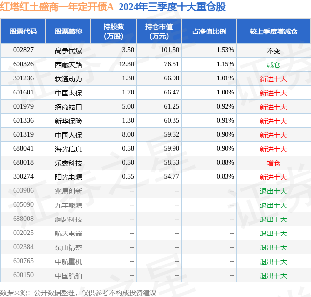 红塔红土盛商一年定开债A的前十大重仓股如下: