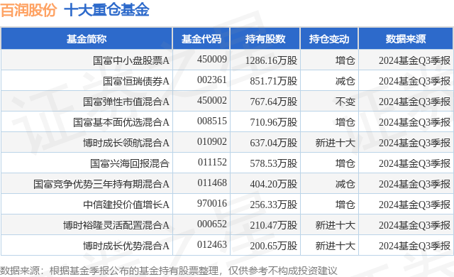 根据2024基金Q3季报公募基金重仓股数据,重仓该股的公募基金共24家,其中持有数量最多的公募基金为国富中小盘股票A。国富中小盘股票A目前规模为36.47亿元,最新净值2.4183(12月23日),较上一交易日下跌0.42%,近一年上涨9.3%。该公募基金现任基金经理为赵晓东。赵晓东在任的基金产品包括:国富弹性市值混合A,管理时间为2014年12月19日至今,期间收益率为187.67%;国富恒瑞债券A,管理时间为2016年2月4日至今,期间收益率为59.92%;国富基本面优选混合A,管理时间为2020年2月13日至今,期间收益率为57.66%。