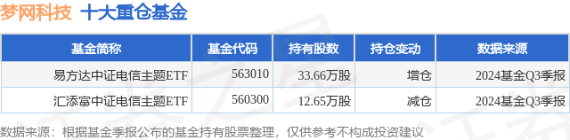 根据2024基金Q3季报公募基金重仓股数据,重仓该股的公募基金共2家,其中持有数量最多的公募基金为易方达中证电信主题ETF。易方达中证电信主题ETF目前规模为0.65亿元,最新净值1.3059(12月24日),较上一交易日上涨0.16%。该公募基金现任基金经理为鲍杰。鲍杰在任的基金产品包括:易方达中证沪港深300ETF,管理时间为2022年12月10日至今,期间收益率为6.04%;易方达黄金ETF联接A,管理时间为2023年8月19日至今,期间收益率为32.99%;易方达黄金ETF,管理时间为2023年8月19日至今,期间收益率为34.68%。