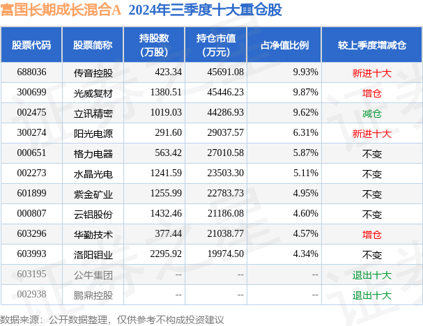 根据2024基金Q3季报公募基金重仓股数据,重仓该股的公募基金共64家,其中持有数量最多的公募基金为富国长期成长混合A。富国长期成长混合A目前规模为45.5亿元,最新净值0.7392(12月25日),较上一交易日下跌0.05%,近一年上涨4.02%。该公募基金现任基金经理为谢家乐 蒲世林。蒲世林在任的基金产品包括:富国城镇发展股票,管理时间为2018年12月19日至今,期间收益率为122.67%;富国周期优势混合A,管理时间为2021年12月8日至今,期间收益率为-21.18%;富国均衡策略混合,管理时间为2021年12月8日至今,期间收益率为-23.55%;富国远见精选三年定期开放混合,管理时间为2023年12月4日至今,期间收益率为6.96%。