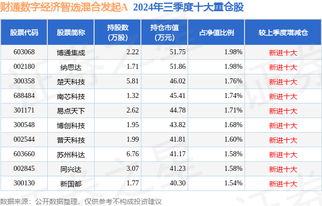 根据2024基金Q3季报公募基金重仓股数据,重仓该股的公募基金共1家,其中持有数量最多的公募基金为财通数字经济智选混合发起A。财通数字经济智选混合发起A目前规模为0.14亿元,最新净值1.1899(12月25日),较上一交易日下跌2.0%。该公募基金现任基金经理为朱海东 顾弘原。朱海东在任的基金产品包括:财通沪深300指数增强,管理时间为2019年7月16日至今,期间收益率为43.41%;财通智选消费股票A,管理时间为2021年1月27日至今,期间收益率为-32.36%;财通中证500指数增强A,管理时间为2023年7月13日至今,期间收益率为-1.33%;财通中证1000指数增强A,管理时间为2023年11月7日至今,期间收益率为3.07%。顾弘原在任的基金产品包括:财通智选消费股票A,管理时间为2022年8月5日至今,期间收益率为-18.94%;财通中证ESG100指数增强A,管理时间为2023年1月16日至今,期间收益率为8.18%;财通多策略福瑞混合发起式(LOF)C,管理时间为2023年4月11日至今,期间收益率为-3.51%;财通中证500指数增强A,管理时间为2023年7月13日至今,期间收益率为-1.33%。
