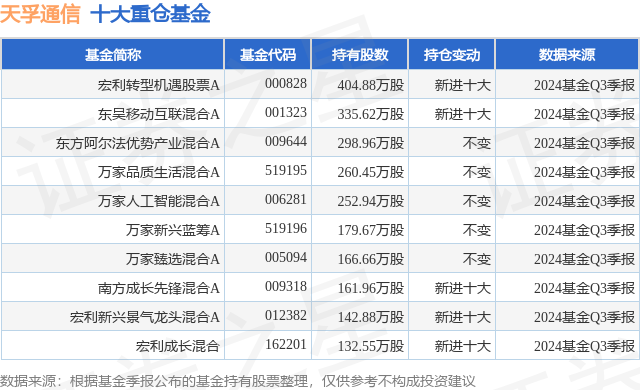 根据2024基金Q3季报公募基金重仓股数据,重仓该股的公募基金共246家,其中持有数量最多的公募基金为宏利转型机遇股票A。宏利转型机遇股票A目前规模为37.25亿元,最新净值2.505(12月25日),较上一交易日下跌0.2%,近一年上涨36.36%。该公募基金现任基金经理为王鹏。王鹏在任的基金产品包括:宏利高研发6个月持有混合A,管理时间为2020年12月28日至今,期间收益率为24.5%;宏利成长混合,管理时间为2020年12月28日至今,期间收益率为20.8%;宏利新兴景气龙头混合A,管理时间为2021年10月25日至今,期间收益率为-31.57%。