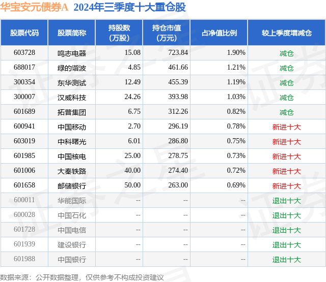 根据2024基金Q3季报公募基金重仓股数据,重仓该股的公募基金共1家,其中持有数量最多的公募基金为华宝安元债券A。华宝安元债券A目前规模为1.28亿元,最新净值1.0683(12月25日),较上一交易日下跌0.07%,近一年上涨6.82%。该公募基金现任基金经理为李栋梁。李栋梁在任的基金产品包括:华宝宝康债券A,管理时间为2011年6月28日至今,期间收益率为80.8%;华宝可转债债券A,管理时间为2016年6月1日至今,期间收益率为55.34%;华宝新飞跃灵活配置混合,管理时间为2017年2月27日至今,期间收益率为110.44%;华宝双债增强债券A,管理时间为2021年4月23日至今,期间收益率为5.74%。