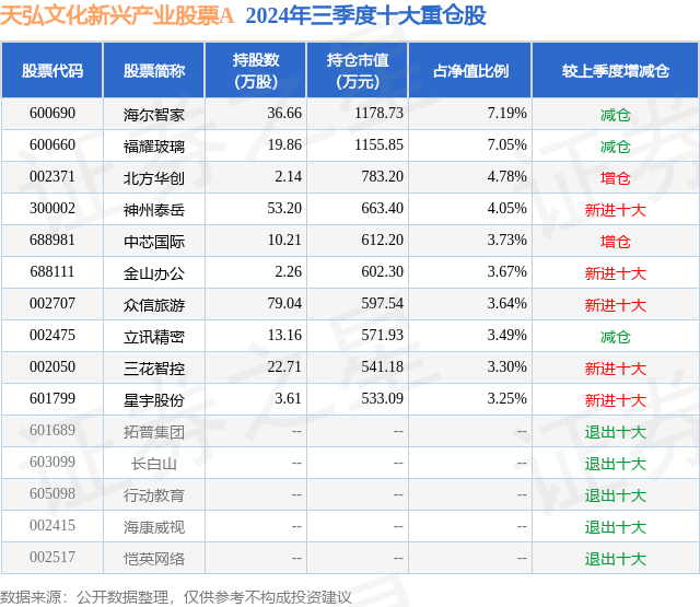 天弘文化新兴产业股票A的前十大重仓股如下: