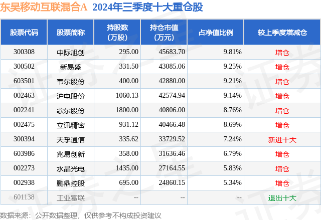 根据2024基金Q3季报公募基金重仓股数据,重仓该股的公募基金共458家,其中持有数量最多的公募基金为东吴移动互联混合A。东吴移动互联混合A目前规模为14.58亿元,最新净值3.2703(12月25日),较上一交易日下跌0.44%,近一年上涨36.88%。该公募基金现任基金经理为刘元海。刘元海在任的基金产品包括:东吴新趋势价值线混合,管理时间为2019年4月29日至今,期间收益率为270.73%;东吴新能源汽车股票A,管理时间为2022年1月25日至今,期间收益率为22.3%;东吴嘉禾优势精选混合A,管理时间为2023年8月15日至今,期间收益率为29.27%。