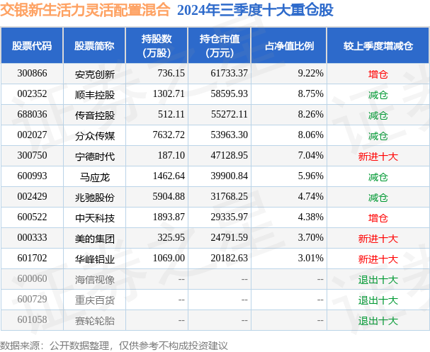交银新生活力灵活配置混合的前十大重仓股如下: