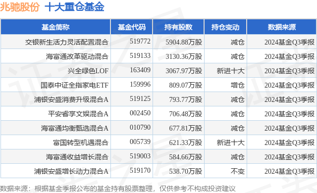 根据2024基金Q3季报公募基金重仓股数据,重仓该股的公募基金共34家,其中持有数量最多的公募基金为交银新生活力灵活配置混合。交银新生活力灵活配置混合目前规模为66.96亿元,最新净值2.162(12月25日),较上一交易日下跌0.83%,近一年上涨7.08%。该公募基金现任基金经理为杨浩。